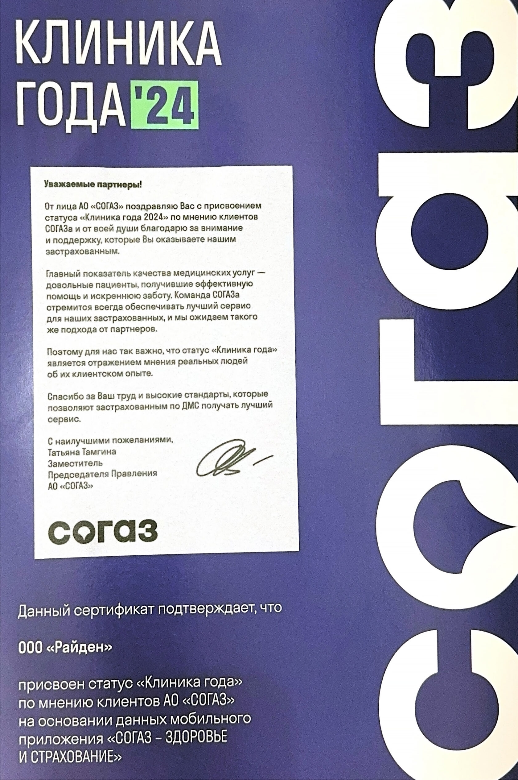 Стоматологическая клиника "РАЙДЕН" удостоена престижной награды от страховой компании СОГАЗ и получила статус "Клиника года"! Эта высокая оценка – прямое отражение положительного клиентского опыта и признание высокого уровня сервиса, предоставляемого застрахованным по ДМС. СОГАЗ отметила "РАЙДЕН" за неустанный труд и приверженность высоким стандартам качества, которые позволяют пациентам получать стоматологическую помощь премиум-класса. Мы гордимся доверием наших пациентов и продолжим делать все возможное, чтобы Ваше здоровье и комфорт оставались нашим главным приоритетом.